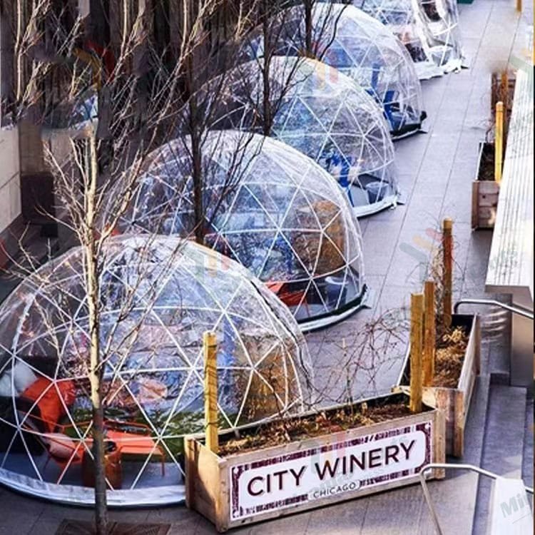 A transparent geodesic dome sits on a wooden deck, with a dining table inside and mountainous scenery in the background.