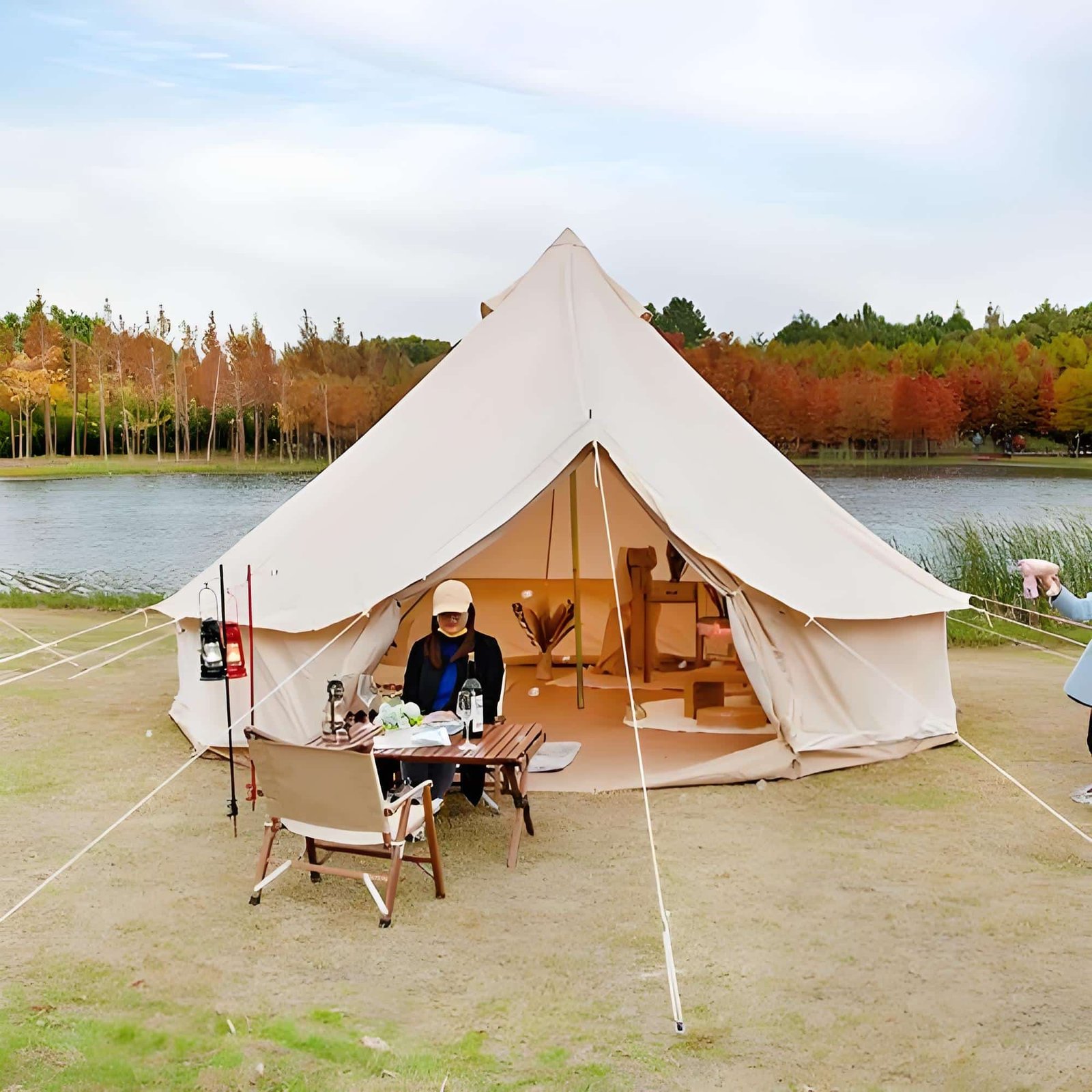 Uma pessoa senta-se a uma mesa com equipamento de campismo no exterior de uma grande tenda bege junto a um lago, rodeada por árvores de outono.