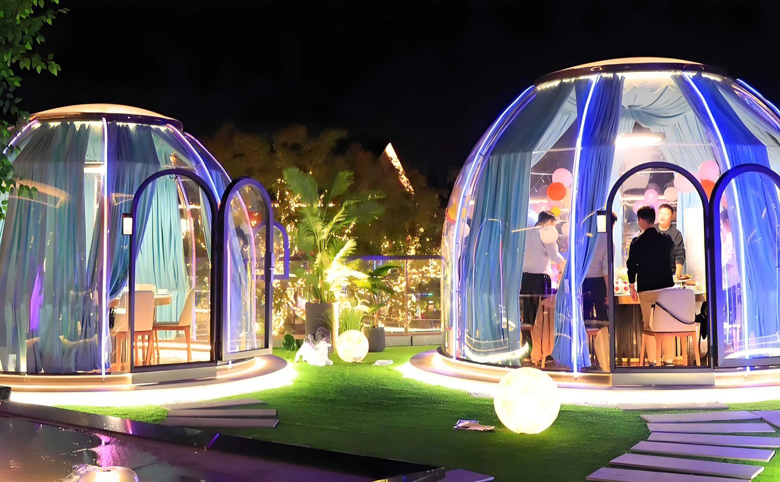 Descobrir o Cúpula de jantar para PC, a modern, transparent polycarbonate (PC) modular structure designed for premium outdoor dining and stargazing experiences. Its spherical shape and durable aluminum frame offer a stable, weather-resistant space with a 360-degree view of the night sky, creating unforgettable moments for guests.