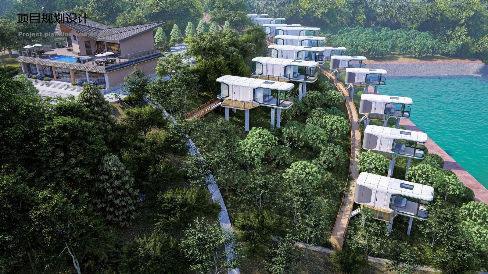 Três cápsulas modernas e minimalistas, denominadas PX7, PX5 e PX3, estão situadas à beira do lago com espreguiçadeiras, uma piscina e um cais num ambiente sereno e noturno, rodeado por árvores e água.